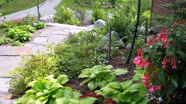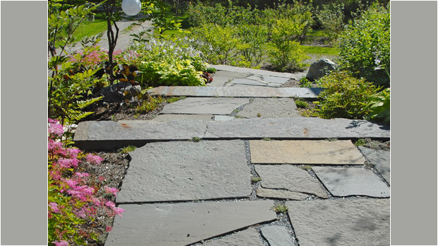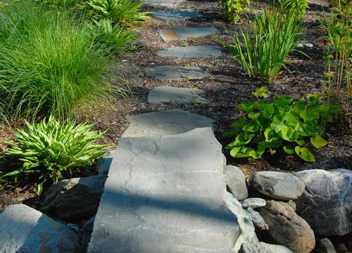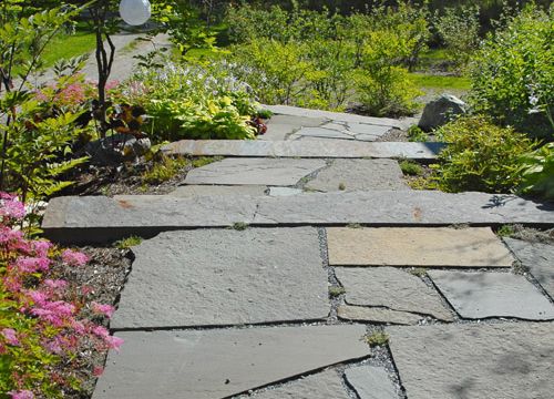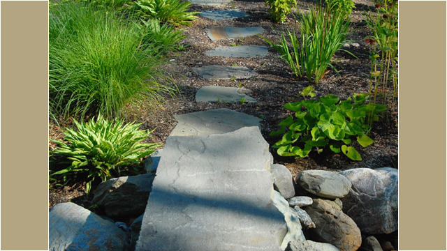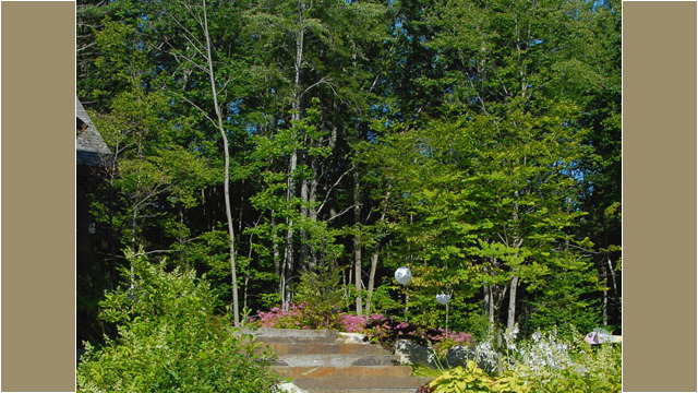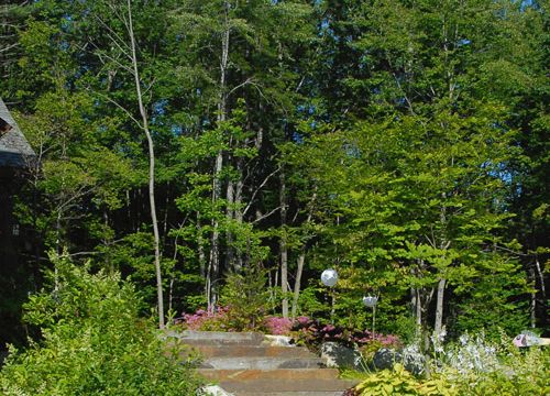Within this setting, narrow lawn paths sweep around the house and lead to hikes in the woods. A natural stone terrace provides a spot for morning coffee and evening dining. Natural stone steps surrounded by mass plantings of groundcovers and perennials provide access to the front door. Boulders from the site accent plantings and pathways and retain slope along the steeper front entry.