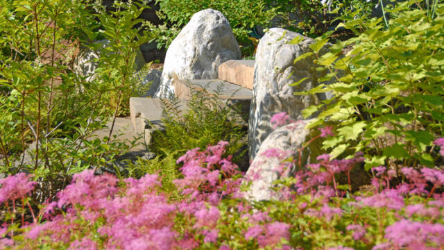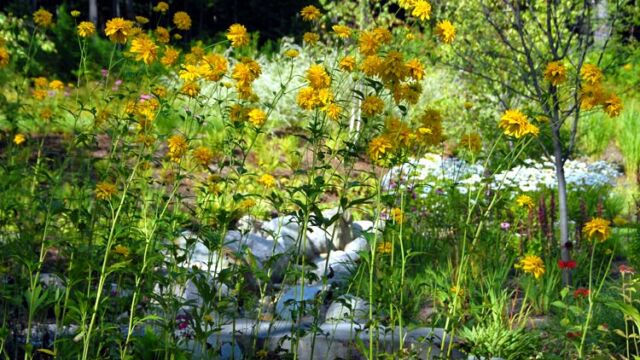 Many plantings repopulated the meadows including existing ferns and groundcovers as well as new native annual and perennial plantings. As in many hillside settings, cuts into the steep slope had created drastic water drainage issues. We built meandering drainage swales with varying sizes of boulders and stones and planted them with water-loving native meadow plants. These plantings spread across the hillside, eventually morphing into native wildflower seeded meadows.