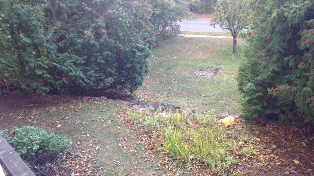 The western yard was bisected by an extremely thick, overgrown hedge of yew and arborvitae. Removal of these allowed for a more elegant space suitable for more stable stairways, gardens, and exposed the trunk of a magnificent Shagbark hickory.