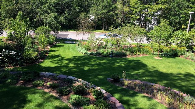 Airflow in the yard returned and the red stone walls and ledges were once again exposed. Flowering trees, shrubs, and perennials edge the western lawn and provide summer screening form the lower road. Terrace walls were re-built of the native stone, presumably excavated from the site in the 1920s.