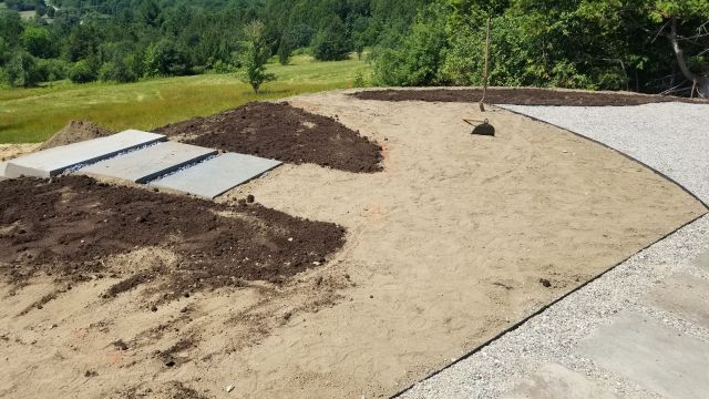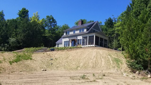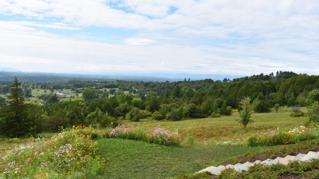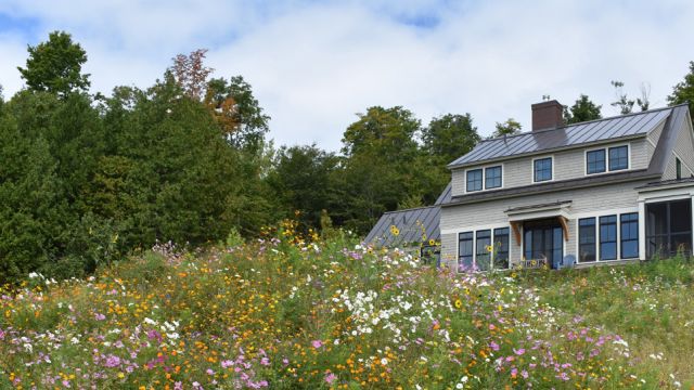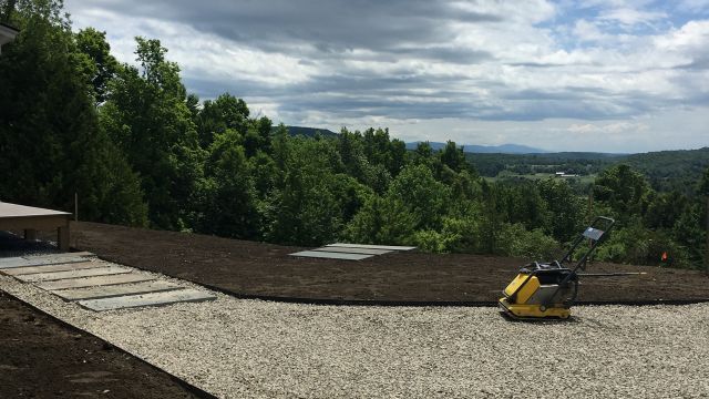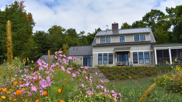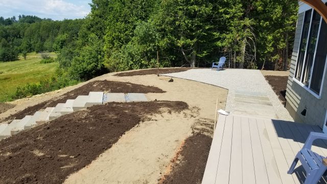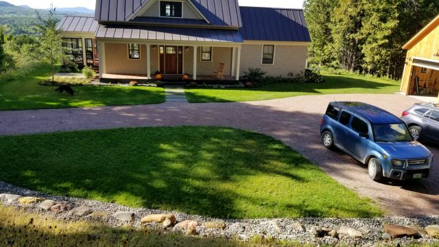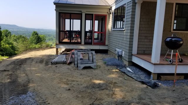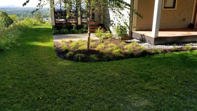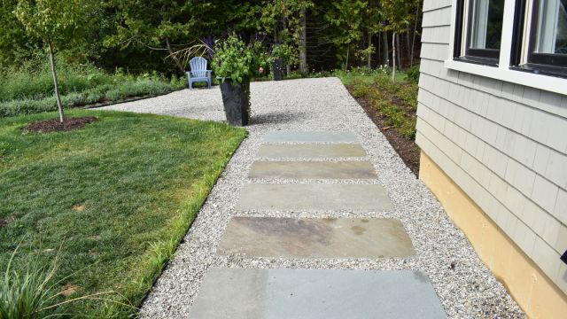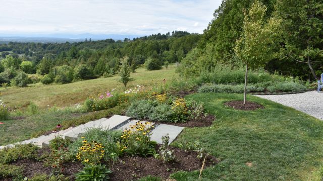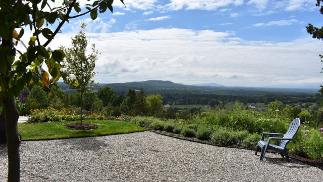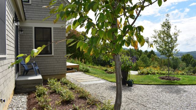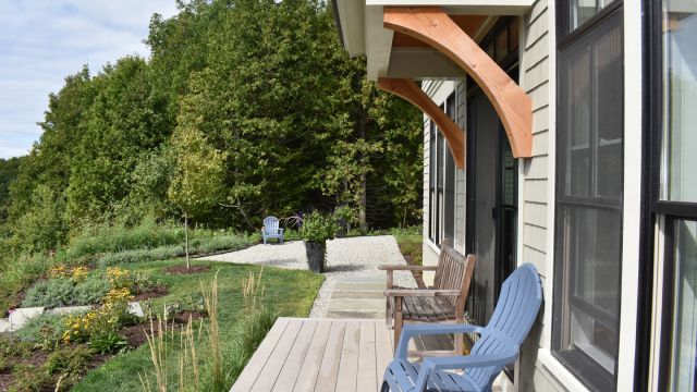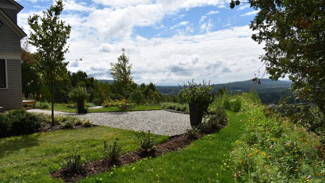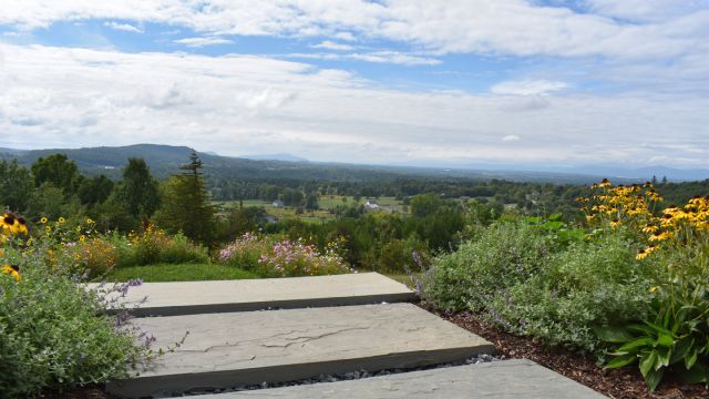 The challenge with the site was to allow for quality outdoor spaces within the steep confines of a mountain slope. We swung the drive close to the front porch in order to maximize the lawn (future vegetable garden) across the drive. A river birch screens the front porch from the drive. On the south side of the house, we nestled in a pea stone patio shaded from the western sun by native trees. This patio has a southeastern view – across meadows and layers of hills, culminating with the ridge lines of the Green Mountains. Once we designed the grades and terraces, we then dealt with the sloping hillside. A stone stairway approaches the terrace and upper gardens. From the grassy hub, a wide sloping grass path heads down to a lower field where a small orchard and grape vines are located. The lower slopes were stabilized with wildflowers.